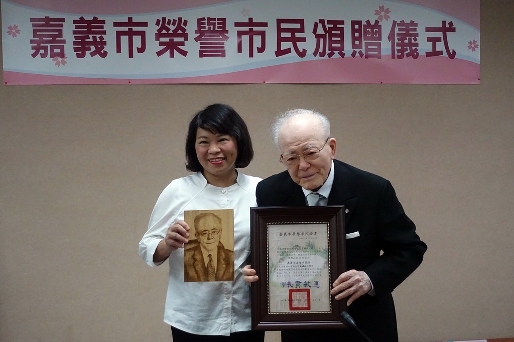 ▲▼ 嘉義市長黃敏惠頒贈名城政次郎先生(圖右)榮譽市民。(圖/記者翁伊森翻攝)