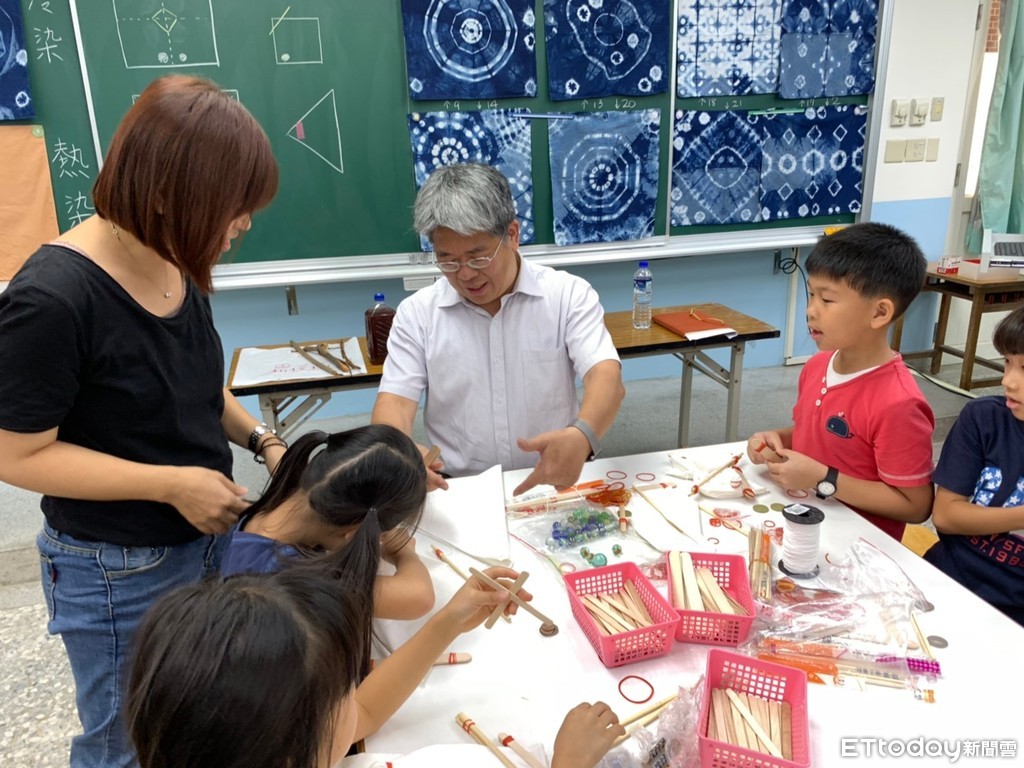 ▲南大附小邀請三股國小,兩校親師生52人,一起利用紅樹科的紅海欖枝條和藍靛來染布,學生透過熱染與冷染方式,分別完成多樣化的作品,讓學童笑開懷。(圖/記者林悅攝,下同)