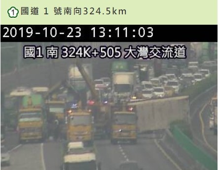 國道一號大灣段南下324公里處,23日中午12時18分左右發生2小客車和貨櫃車追撞事故,造成大型貨櫃車翻覆,占用主線3線道,一度造成南下車流回堵,事故現場於下午2時23分恢復全線正常通車,現場無人員傷亡,目前肇事原因及相關責任由四大隊新市分隊調查處理中。