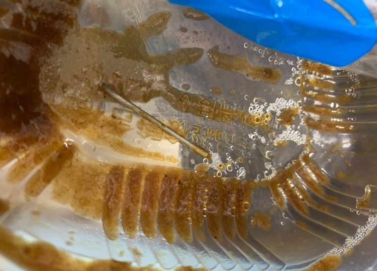 原PO在PTT貼出照片,濃郁的咖哩醬內除了有豬肉、馬鈴薯、紅蘿蔔,竟然還有一根細長的鐵棒,疑似是從生產管線的機器掉落,不小心一起裝進了餐點中,幸好眼尖地他有發現這根異物,否則吃進去可能會刺傷食道。
