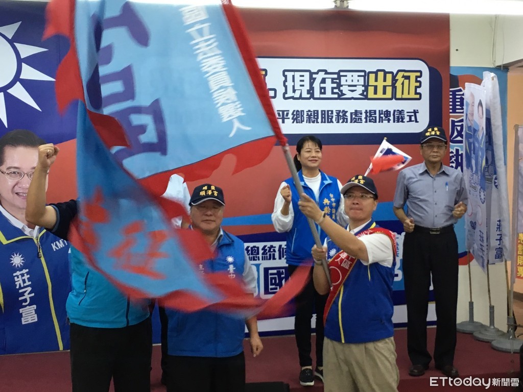 距離明年大選僅剩79天,莊子富上午由市黨部主委顏文正授予戰旗,彰化縣副縣長洪榮章贈與順澤宮冠軍帽之後,大家高唱「出征」,然後站上戰車前往大里、太平兩地掃街,出席者還有苗栗縣副縣長鄧桂菊,台中市議員賴義鍠、冉齡軒,藝人鳥來嬤吳敏等熱情支持者近百人。