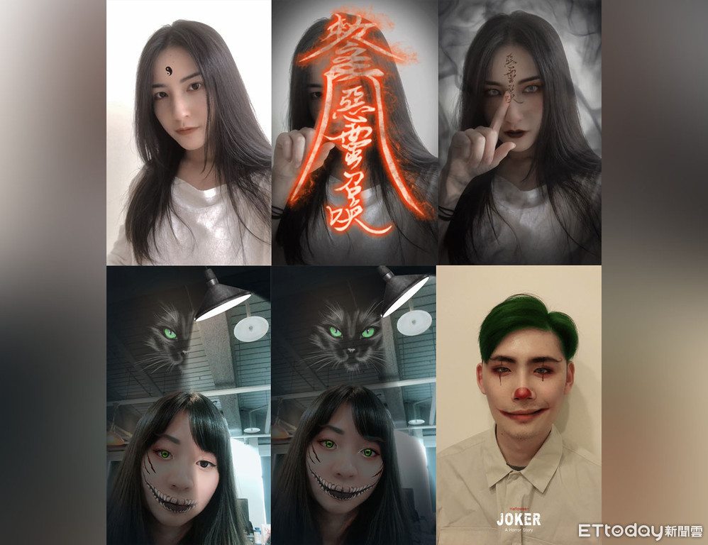 而主打拍人像專業的《美顏相機》這次則是推出10多款恐怖唯美鬼魅妝容,妝感自然服貼且逼真,包括今年人氣角色小丑,自然AR染髮讓綠頭髮非常仿真,以及其他鬼妝惡靈符咒妝、鬼新娘妝、骷髏皇冠、黑貓裂嘴妝等東方及西洋鬼怪妝容。