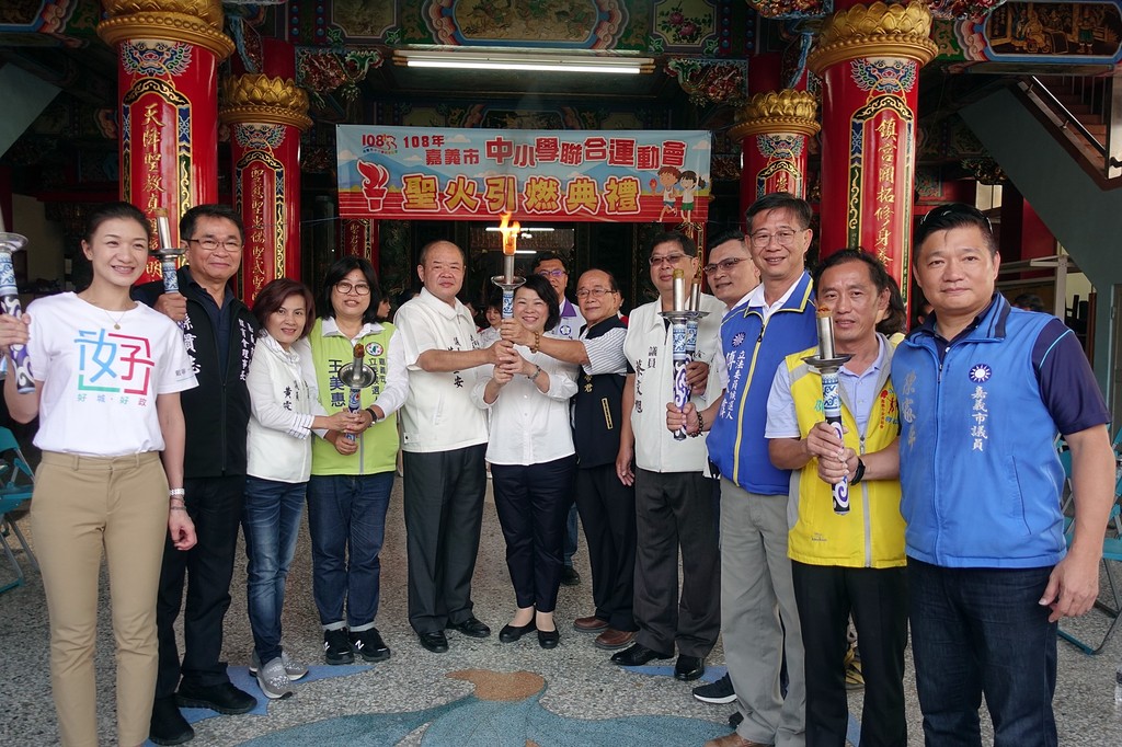 「108年嘉義市中小學聯合運動會-聖火引燃典禮暨傳遞活動」24日上午在鎮天宮舉行,市長黃敏惠及鎮天宮董事長賴旭星帶領各界貴賓及國中小學校長,在關聖帝君座前引燃聖火,象徵中小聯運正式揭開序幕。黃敏惠表示,聖火點燃與傳遞具有教育及神聖的意義,學校要將聖火的意義讓學生知道,也讓市民知道中小聯運就要開始。