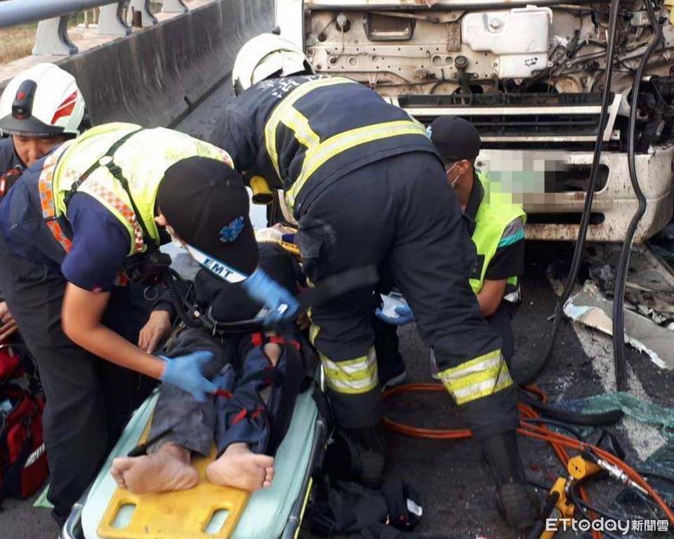 警方初步調查,這起車禍事故發生在清晨6時許,西濱快速道路彰化伸港鄉路段,孫姓駕駛的白色大貨車不明原因撞到一旁的曳引車,兩輛車瞬間卡在路肩,大貨車孫姓駕駛受困在駕駛座,動彈不得,大貨車車頭嚴重毀損。