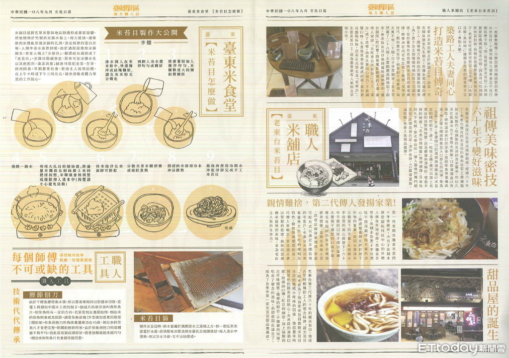 本期除介紹3家米食料理店家的傳承故事外,亦不忘與民眾分享生活中許多年歲時節慶必吃的米食小知識,例如:過年春節必吃的發糕、元宵節的湯圓、端午節紀念屈原的粽子以及原住民族傳統慶典美食阿粨。更在文末以圖繪方式教授米苔目製作方法,條理清楚又簡易製作,讓民眾立即就上手。THE 17 LAB不僅是在地產業共創夥伴,更是連結台東的過去與現在的重要平台。