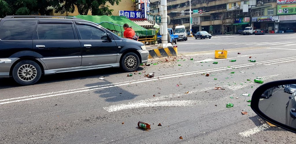 警方指出,案經110勤指中心通報到場查處,警方抵達現場後發現,係名何姓男子駕駛營業用大貨車,由中華南路右轉中華西路口(東往北),車上所載空酒瓶4、5箱因無綑綁,過彎往酒瓶左掉落至分隔島,對向及本向內側車道皆有破碎玻璃酒瓶。