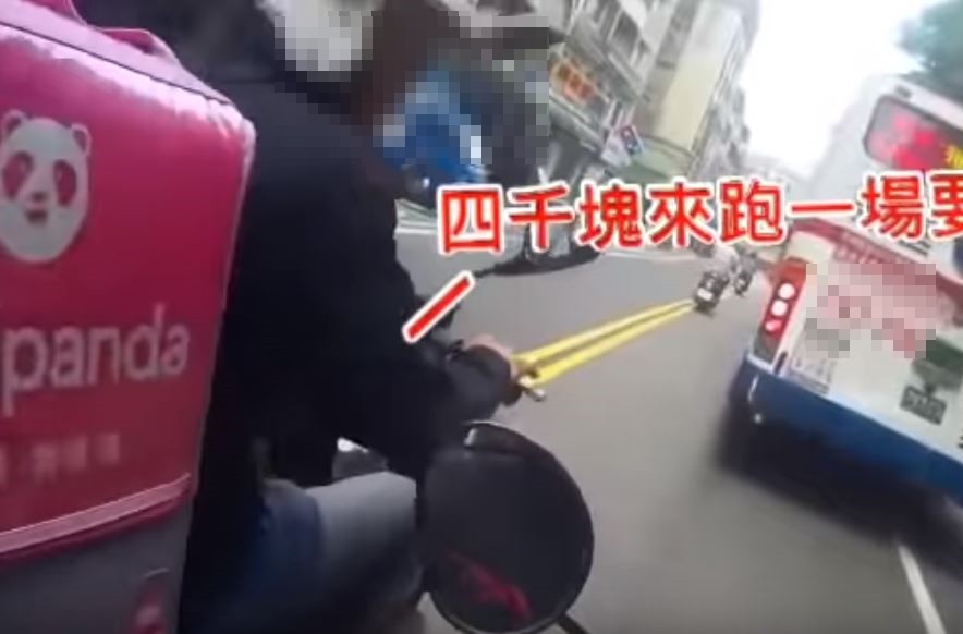 新北市淡水一名foodpanda外送員26日工作途中,疑似不滿被騎士超車,刻意加速逼近騎士,並三度挑釁對方「4千塊跑一場要不要」,但騎士完全不理會他。畫面曝光後立刻引發網友討論,有人笑說「外送員可能忘記他是空腹熊貓,不是功夫熊貓」,警方則表示,若有並行競速的情形,依法可以開罰3萬到9萬元。