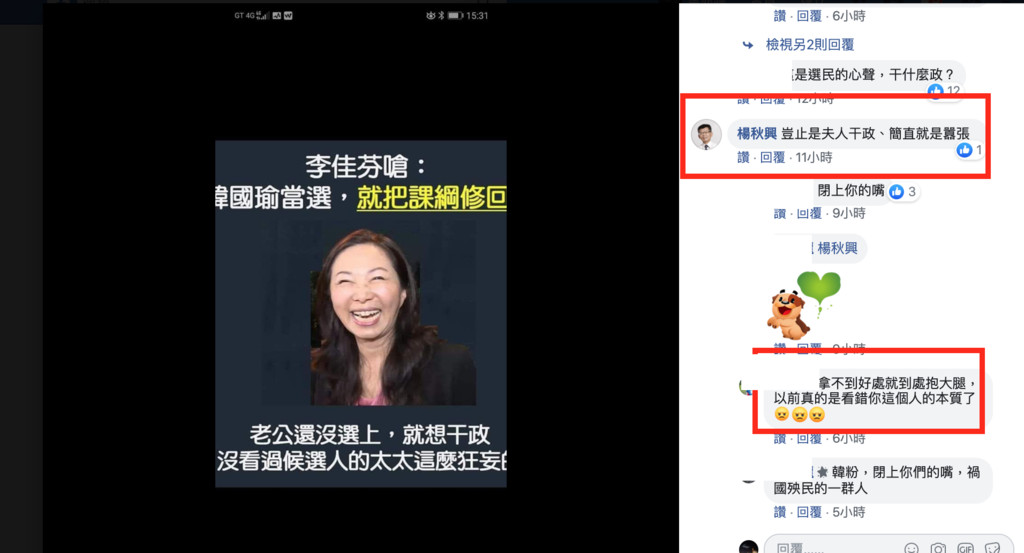 高雄市長韓國瑜妻子李佳芬前往菲律賓,出席海外造勢的時候,李佳芬表示:韓國瑜說過,如果當選,一定會把課綱修回來,也希望藉由教育重新改革,換回孩子們對中華民國的記憶。不過現在卻有人在郭台銘後援會的臉書社團中,貼文轟:「老公還沒選上,就想干政」,結果引來前高雄縣長楊秋興留言呼應:「豈止是夫人干政、簡直就是囂張」。