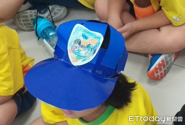 ▲小朋友頭戴自製警徽帽子快樂參觀警分局。(圖/桃園警分局提供)