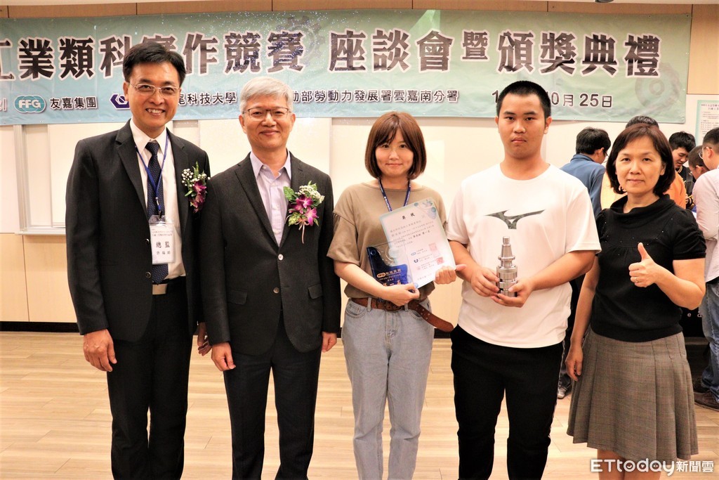 ▲新竹高工老師吳慧詩(中)與學生鄧浩銘(右2)奪冠,雲嘉南分署科長曾秋瑾(右1)、友嘉集團總經理許福助(左1)、虎尾科大副校長沈金鐘(左2)頒獎表揚。(圖/記者林悅翻攝)