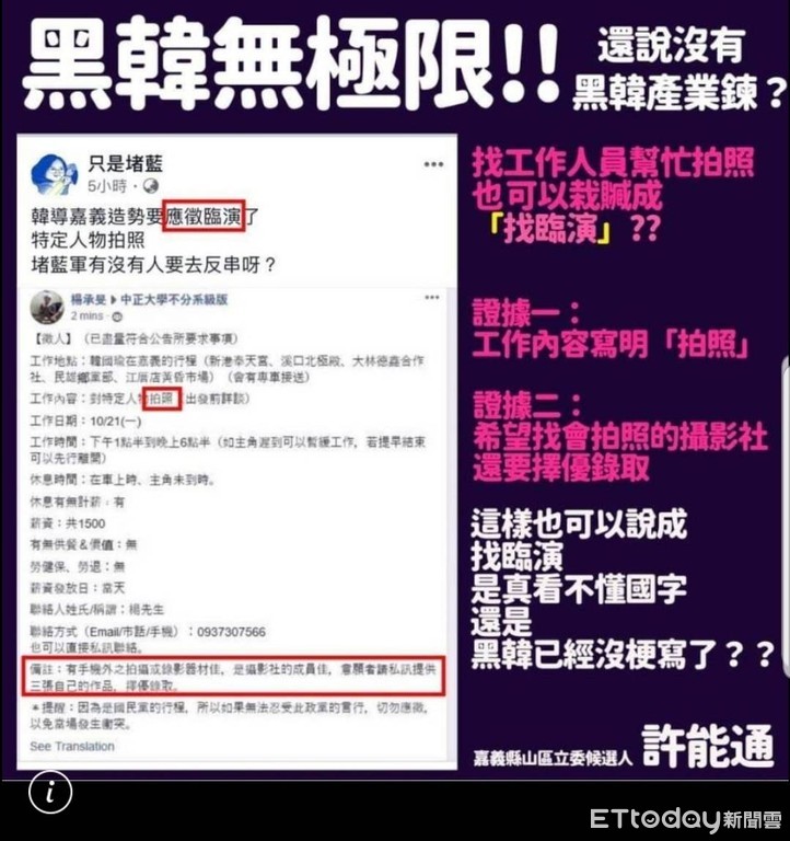 嘉義縣山區許能通競選後援總部工讀生楊承旻,日前因韓國瑜嘉義縣傾聽之旅,上網徵求攝影人員,並於臉書不公開社團「中正大學不分系版」貼徵人訊息,並以「攝影社成員佳」、「有拍攝或錄影器材佳」、「提供三張作品」、「擇優錄取」等文字,卻遭特定粉絲專頁稱「韓導嘉義造勢要應徵臨演了」並附上來自臉書社團中正大學不分系版的截圖。隨後,則以「徵工讀生充當韓粉?大學臉書社團徵人被抓包」獨家跟進報導,並同樣附上臉書截圖,楊同學更多次接到陌生電話,也未接到相關道歉。