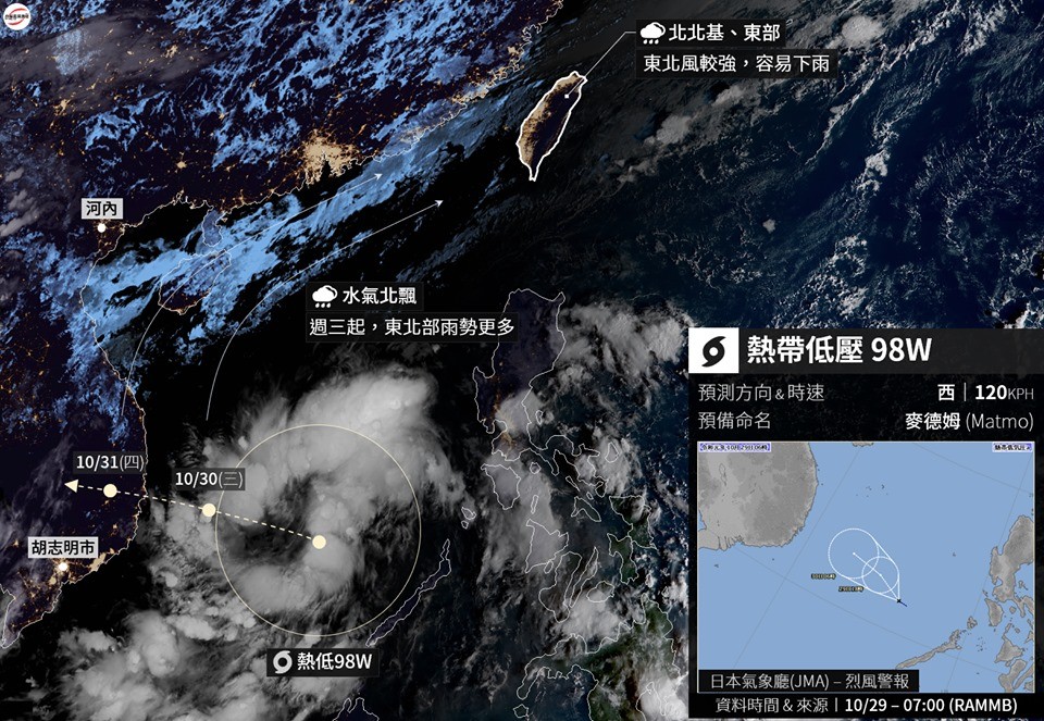 天氣粉專「台灣颱風論壇│天氣特急」指出,熱帶低壓98W快要變颱風,名稱會是「麥德姆」。未來準麥德姆將朝越南前進,預計明、後天就會登陸,命不會太長,但要前往越南的旅客,還是要盯一下。