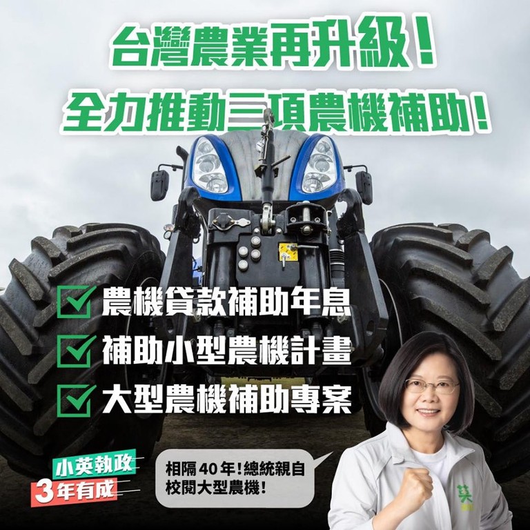 蔡英文表示,政府在過去三年多來,在農業上也有好成績,她也公布了3大成果:首先,是農機貸款補助年息,政府每年提撥10億元補助農機貸款,減輕農友負擔;其次是補助小型農機計畫,目前已經有6萬4000位農友受惠;最後,則是大型農機補助專案,投入8億元補助購買補助曳引機、收穫機。