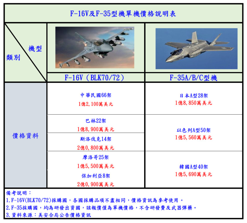 空軍司令部表示,美商洛馬公司所公告之F-35合約價格為供售美軍及初始研發國之價格,並未包含參與研發出資之金額,且各國購買之品項、數量及供貨期程等均不相同,比較周邊國家購買F-35之單機價格均為美金1.5億以上,故無法簡化類比、同等推論。