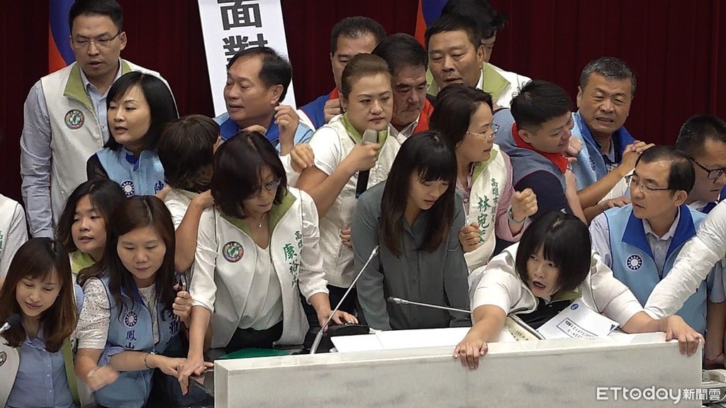 高雄市議會31日下午爆發全武行!國民黨團議員集體進議場時,面對霸佔主席台的民進黨議員們,以包圍的方式護住副議長陸淑美準備上主席台,而民進黨議員則以人牆方式死命抵住,雙方衝突就此展開,只見藍綠議員打成一團,拉扯、推擠,現場一片混亂。