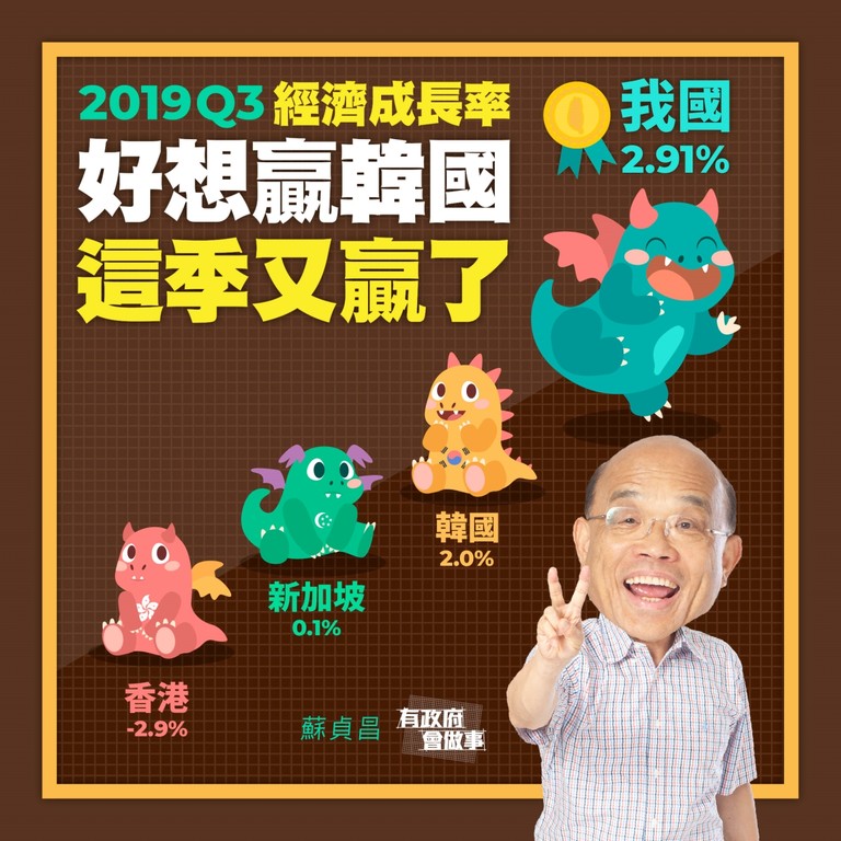 蘇貞昌表示,「根據本週行政院主計總處公布的最新數據,台灣第三季經濟成長率來到2.91%,不只能贏韓國,連香港、新加坡都比下去!」
