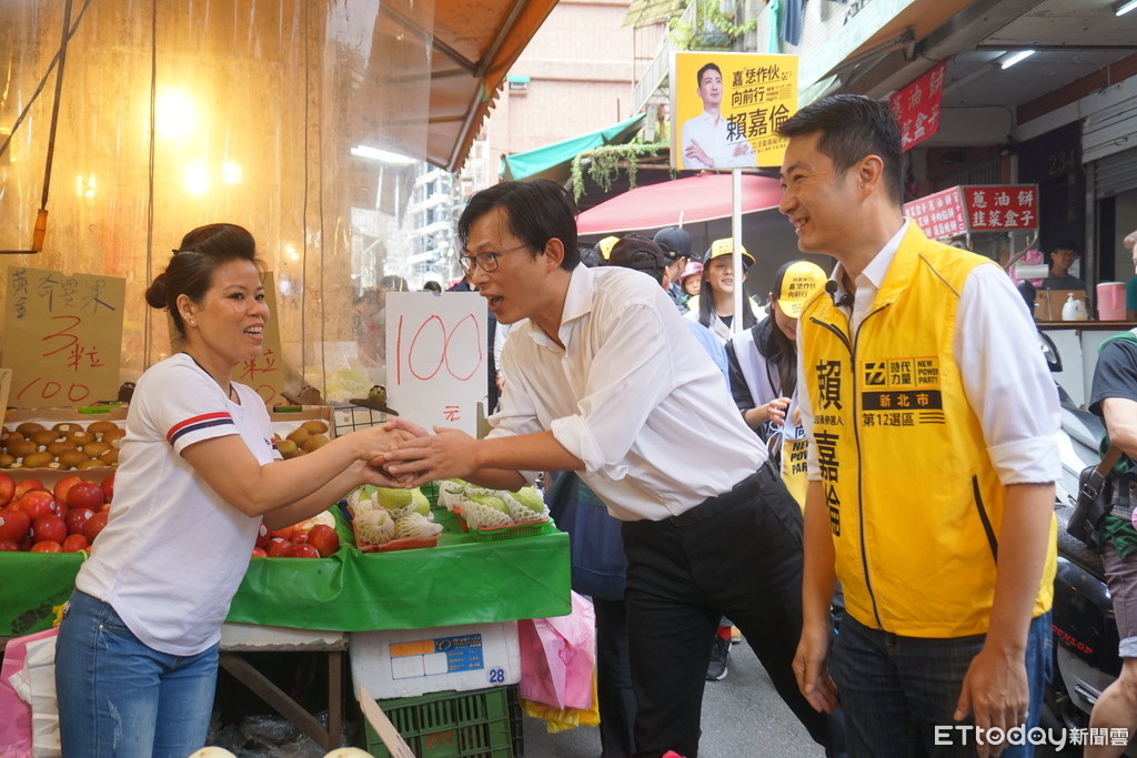 ▲徐永明、黃國昌陪同賴嘉倫前往汐止中正市場拜票。(圖/記者林銘翰攝)
