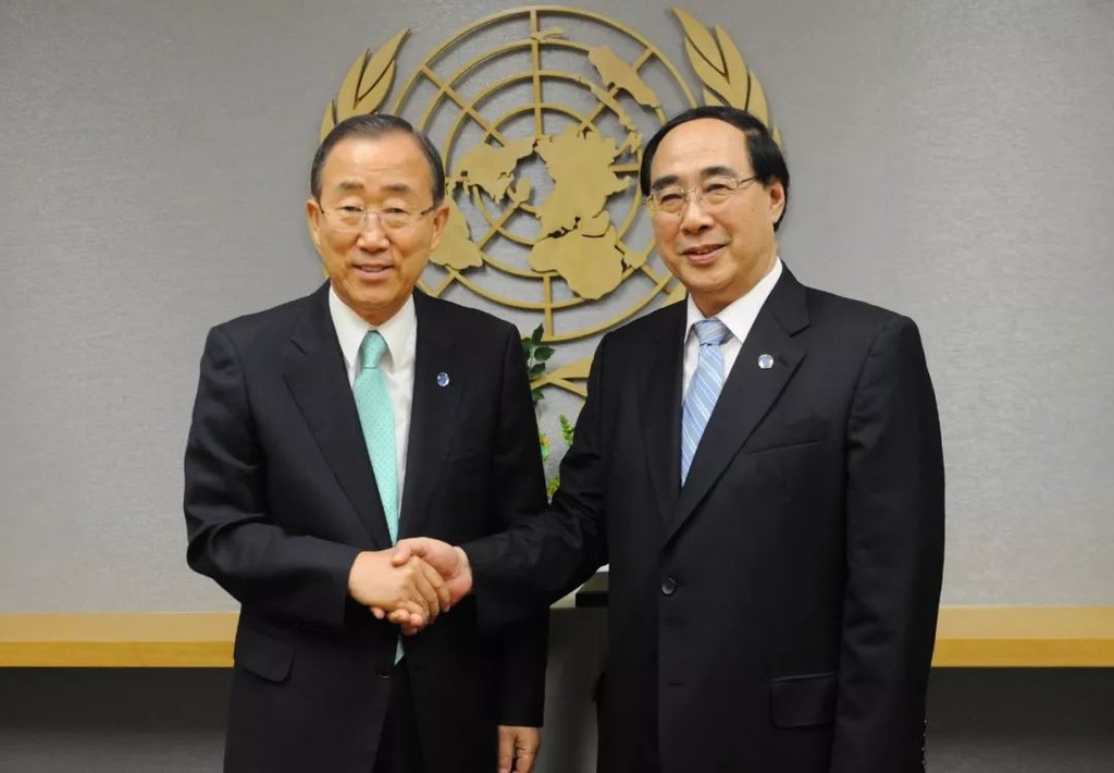 ▼ 吳紅波(右)於2012年8月就任聯合國副秘書長,與時任秘書長潘基文握手。(圖/微信公眾號/長安街知事)