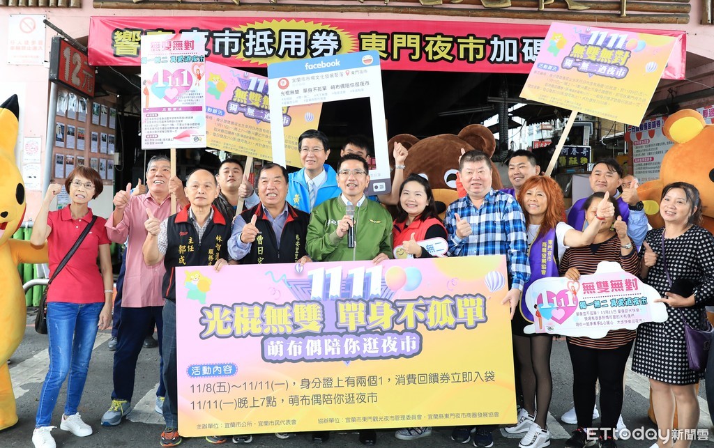 你是光棍就有有好康!11/8-11/11期間晚上7-9點,凡出示身分證號碼或出生年月日內含有兩個1證明,即可領取宜蘭東門夜市50元消費回饋券1張(符合資格者,每人每日限領1張),活動期間每日發放250張(發完為止)。另外,宜蘭市公所於11日晚上7-9點更加碼「光棍無雙,單身不孤單,萌布偶陪你逛夜市」的活動,有多位萌布偶陪你逛夜市,撩心事。