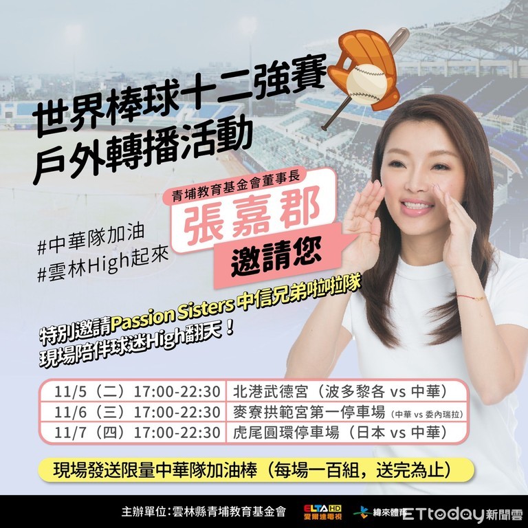 青埔教育基金會特別舉辦戶外轉播活動,邀請鄉親一起來為中華隊選手加油打氣,給予爭取參加東京奧運棒項目比賽資格的最大鼓勵和能量,青埔教育基金會董事長張嘉郡指出,特別舉辦戶外轉播活動,邀請鄉親球迷們來為中華隊加油、讓雲林HIGH起來,現場轉播中特別邀請Passion Sisters中信兄弟啦啦隊,陪伴球迷HIGH翻天。