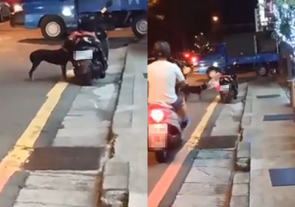 ▲外送員路邊停車,黑狗兄挖寶搶走一盒餐點,路過騎士看傻。(圖/翻攝自爆廢公社)