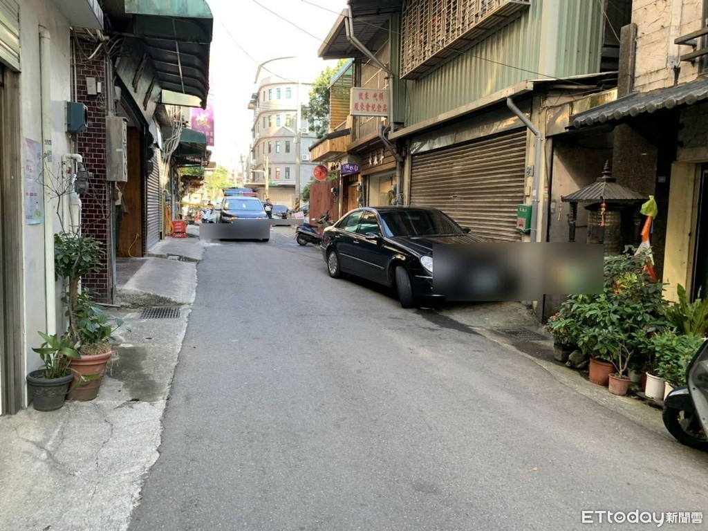 ▲黑色賓士車進入小巷子內,撞上店家鐵門後,駕駛棄車逃逸無蹤。(圖/記者黃孟珍翻攝)