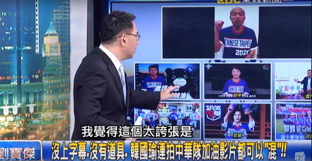 在另一段節目中,劉寶傑指出,所有的縣市首長在棒球十二強應援片都卯足了全勁來展現有多熱愛棒球,後來才發現韓國瑜是最混的「你現在沒有工作,你也不趕高雄、你也不去總質詢、選舉也選得零零落落」結果拍出來的影片格式不對,所有人的影片都有上字幕,韓國瑜的連字幕都沒有,其他人都有設計、都有道具,韓國瑜連個加油棒都沒有!