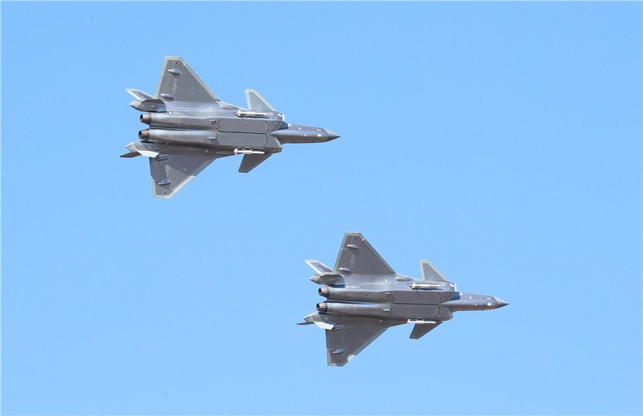 ▲慶祝解放軍空軍成立70週年,殲-20雙機掛彈表演。(圖/翻攝微博)