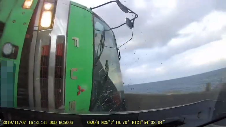 這起事件發生在7日下午,當時Lexus轎車駕駛行經台二線北部濱海公路83k處,對向一輛大貨車疑似因為轉彎時重心不穩,導致貨物嚴重傾斜,向前行駛後往側邊翻覆,接著推撞到Lexus車輛,導致車頭轉彎將近180度。