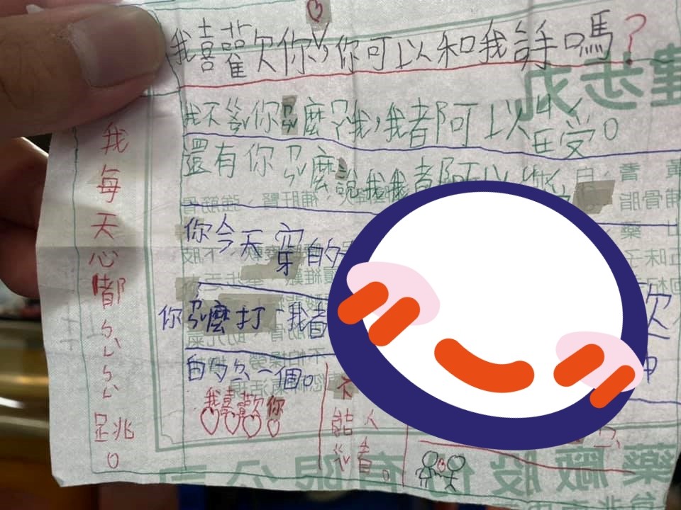 只見對方拿了一張日曆紙,還用了紅、藍、綠、黑4種顏色撰寫這封「情書」,上頭寫道「我喜歡你,你可以和我ㄑㄧㄢ手嗎?我不ㄍㄨㄢˇ你ㄗㄣˇ麼ㄇㄚˋ我,我都可以ㄐㄧㄝ受。還有你ㄗㄣˇ麼說我我都可以ㄐㄧㄝ受。你今天穿的好美麗,很ㄆㄧㄠˋ亮我很喜歡,你ㄗㄣˇ麼打我都不會說痛,你是我心目中的ㄉㄧˋ一個。我喜歡你❤❤❤❤」
