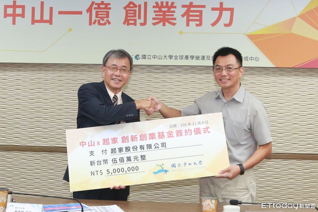▲中山大學校長鄭英耀(左)將台幣500萬元支票交給第一個獲得「中山創新創業基金」補助的校友創業團隊「起家」負責人李信成。(圖/中山大學提供)