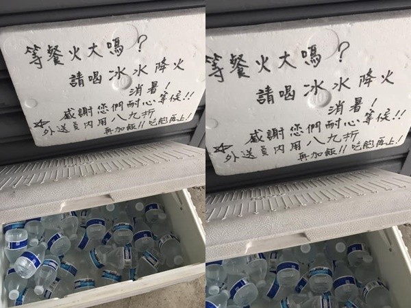 該名外送員在臉書社團「UberEATS台灣」PO出照片,可以看見店家在保麗龍上寫著「等餐火大嗎?請喝冰水降火、消暑!感謝您們耐心等候!!外送員內用89折再加飯!!吃飽在(再)上!」下方還有一桶冰水任外送員拿取。