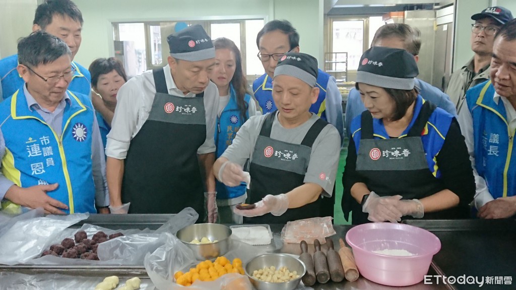 國民黨總統參選人韓國瑜9日傾聽之旅前進基隆,下午到暖暖知名餅店「珍味香餅店」體驗製作名產「帝王酥」,在餅店老師傅的帶領下,從捏製麵糰、包餡、桿麵皮等步驟,都親手嘗試,旁人稱讚韓國瑜手藝不錯,韓國瑜幽默表示,可能平常都有在做家事,所以才能很快上手。
