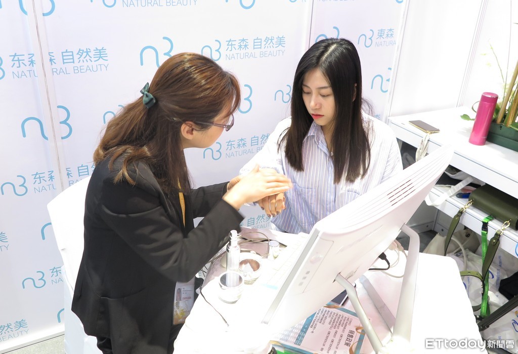 ▲東森自然美參展第二屆中國國際進口博覽會,專業美容師對企業代表介紹產品。(圖/記者陳政錄攝,下同)