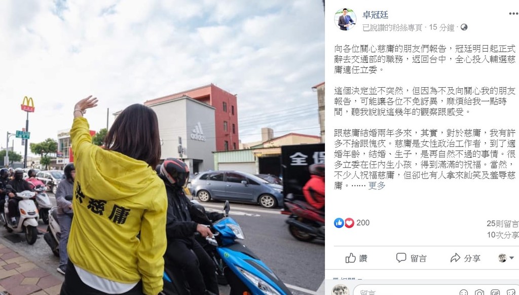 卓冠廷10日傍晚在粉絲專頁發文,宣布明日將辭去交通部職務,回台中全心投入輔選妻子洪慈庸連任立委。以下為臉書全文: