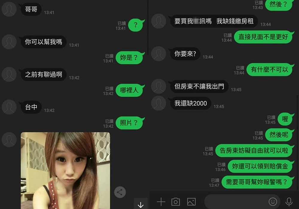 「好恐怖的房東,為了兩千塊就囚禁房客」,一名男網友日前收到LINE訊息,乍看之下似乎是個女孩子傳的,她開頭就直求救「哥哥,你可以幫我嗎?」想要跟原PO討兩千元,還說自己被房東囚禁。但仔細一看對話,只見原PO馬上嗅出端倪、從容應對,一番回話讓網友笑噴,「哥哥,你報警後會抓到一票人。」