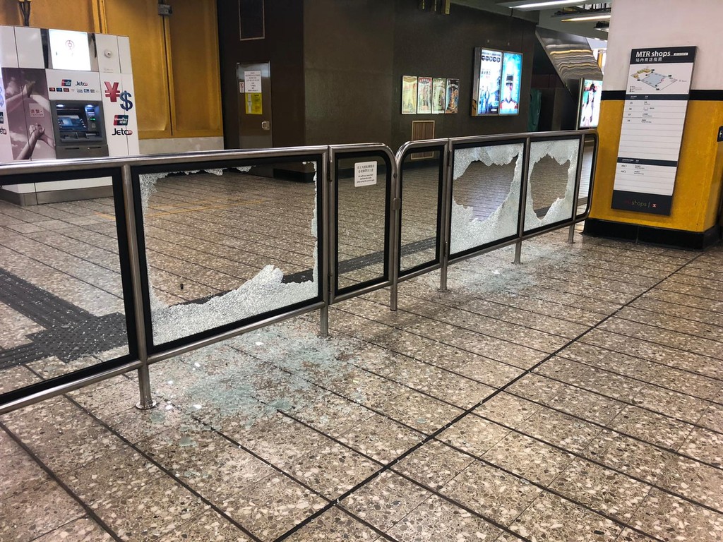 從曝光的照片中,可以看到不僅鐵路上出現雜物,車站的驗票口也有物品燃燒,車站內的護欄玻璃也遭砸碎,還有疑似車站內的通道遭人以木棍阻攔。