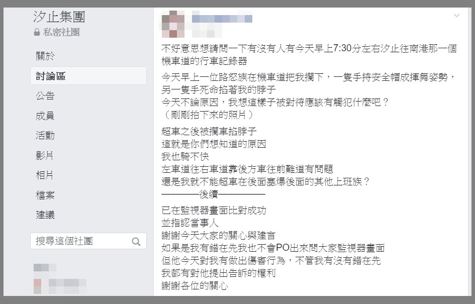 ▲12日有網友在臉書汐止集團上傳遭路怒族攻擊情事。(圖/翻攝臉書)