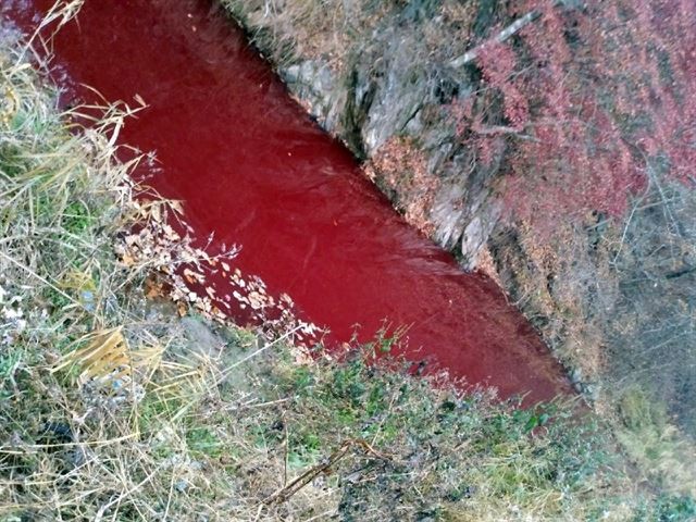 ▲ 臨津江支流被染紅發臭,附近居民相當困擾。(圖/漣川臨津江市民網)