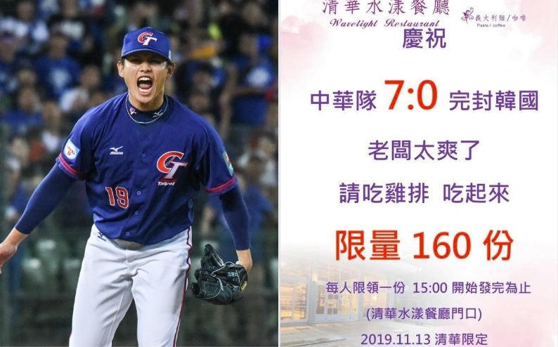 對此,新竹清華水漾餐廳也特別發文表示,「慶祝中華隊7:0完封韓國隊,今日(13日)15:00在本店門口發放,數量有限要來要快!!」