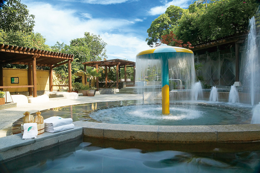 春天酒店緊鄰陽明山國家公園,群山環繞中透著優雅的氣質,又因位居「大磺嘴」源頭,終年擁有源源不絕地頂級白磺原湯,其色澤呈乳白色,而有『牛奶湯』和『帝王泉』之稱。酸鹼值在PH4-5,屬天然弱酸性純泉,平均溫度約38~42度。春天最大的特色是擁有北投地區最大的露天風呂,計有九種溫泉SPA湯池,每個湯池皆有不同功能及特色,包括親子戲水浴池、浮浴、冷水浴、石板浴、八角靜態池、氣泡浴、寢浴、衝擊浴、靜態池等。在此泡湯可日賞觀音山,夜眺北投繁榮夜景,感受日夜不同風情。