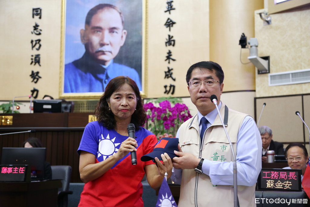 「蔡賴配」將成形,台南市議員王家貞怒批賴清德,在台南7年執政搞得民怨滔天,不甩民主監督,112條無辜生命斷送在登革熱肆虐中,新市政中心、小巨蛋都在騙,只想做驕傲獨裁的皇帝,她特別送上國旗帽給市長黃偉哲,期望心中有國家,做一位謙卑公僕,黃偉哲接受贈禮,並戴上國旗帽跟王家貞合影。