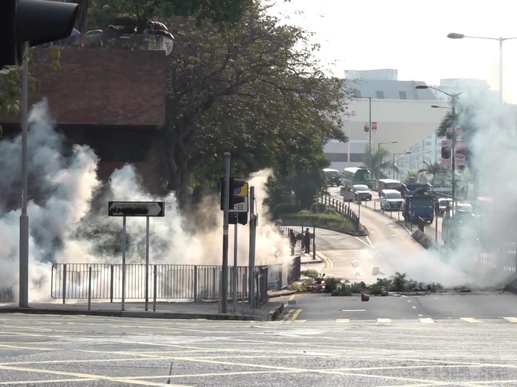 ▲防暴警察向理工大學方向的馬路施放多枚催淚彈。(圖/翻攝自香港電台)