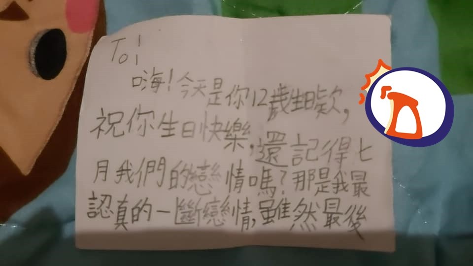 這位媽媽在臉書《爆廢公社》貼出2張照片,只見女兒拿了一張白紙,用鉛筆在上面寫下生日祝賀,「嗨!今天是你12歲生日欸,祝你生日快樂」,接下來突然曝光兩人往日情,「還記得七月我們的戀情嗎?那是我最認真的一斷(段)戀情,雖然最後是我自己選擇分手,但希望你可以記著,總之祝你 生 日 快 樂。」