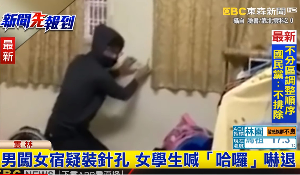 一名雲林科大的女大生日前回到租屋處時,竟發現黑衣男子蹲坐在她的床上、撬開插座面板準備安裝針孔攝影機,氣得說「哈囉?可以幫我開門嗎?」並全程錄影,將影片上傳至網路警告周邊的女學生。
