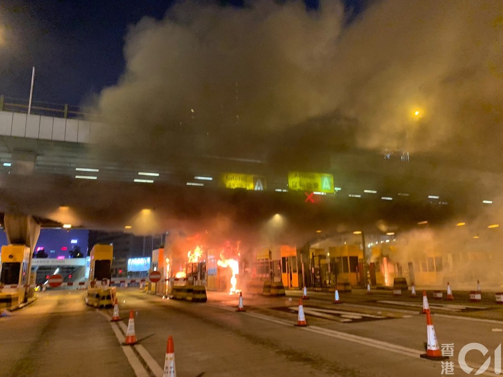 晚上9時,多名黑衣人手持硬物打破紅隧收費亭的玻璃,收費亭被焚,現場濃煙不斷,多次傳出爆炸聲;在場消防員不斷向起火收費亭射水;除了收費亭,電箱及海報位置亦遭破壞。有黑衣人打破電箱玻璃後,電箱起火,有示威者在橋下以揚聲器提醒橋上的人小心。
