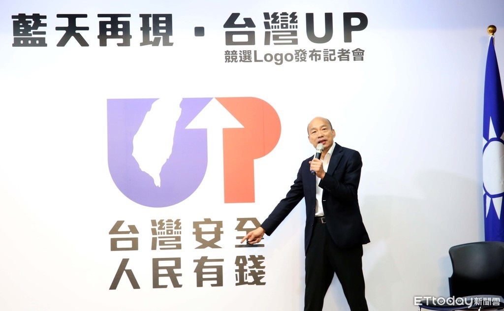 韓國瑜的競選LOGO中,以紅、白、藍國旗三色構成英文「UP」。韓國瑜說明,他去年選高雄市長的意象是高麗菜跟柴犬;而這次的LOGO經過非常長時間討論,希望能讓民眾感覺到台灣的現狀及展望未來,並結合選舉主軸,最後融合相關元素,濃縮成強而有力、既鮮艷又能夠激發士氣的LOGO。