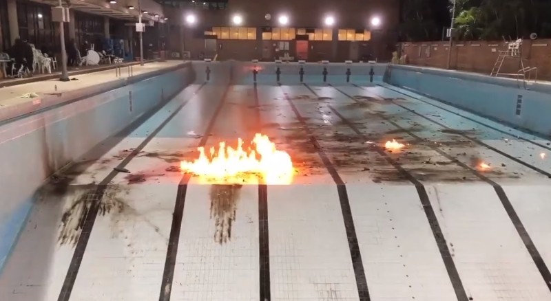 汽油彈之後在泳池底部爆開,燃起熊熊火焰,多處地板也被燻成黑色,估計至少丟過數十個汽油彈。期間有示威者提醒後退一點,也有人高叫「我又玩」,當汽油彈擲出爆出大火時,旁人紛紛起哄。