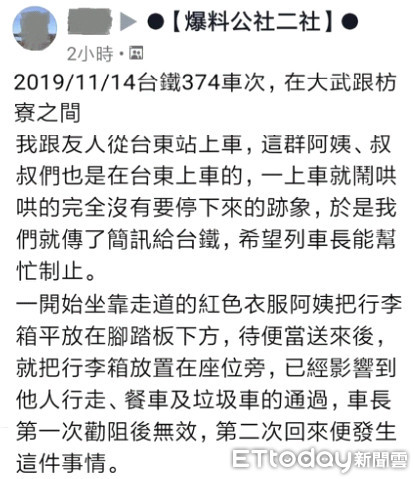 ▲大媽指控列車長找麻煩。(圖/記者楊鈞典翻攝臉書爆料公社二社)