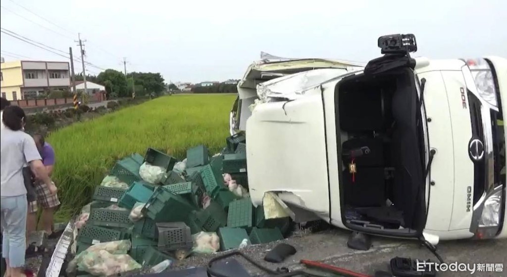 這起車禍發生在中午12時30分,猛烈撞擊聲驚動附近住戶,紛紛跑出來看到自家的稻田跌落2輛四腳朝天的大車,驚嚇不已,而冷凍車的駕駛已經自行脫困,看著被解體的冷凍貨櫃,無奈地蹲著撿拾滿田的冷凍雞肉,鄉民們還一旁協助處理善後。